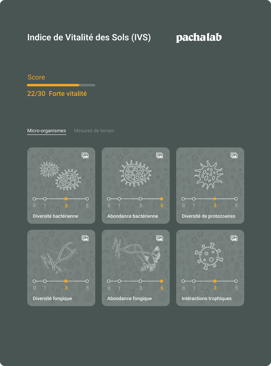 Recevez un score global basé sur la quantité et la diversité des 4 grands groupes de micro-organismes essentiels à l’équilibre de votre sol.