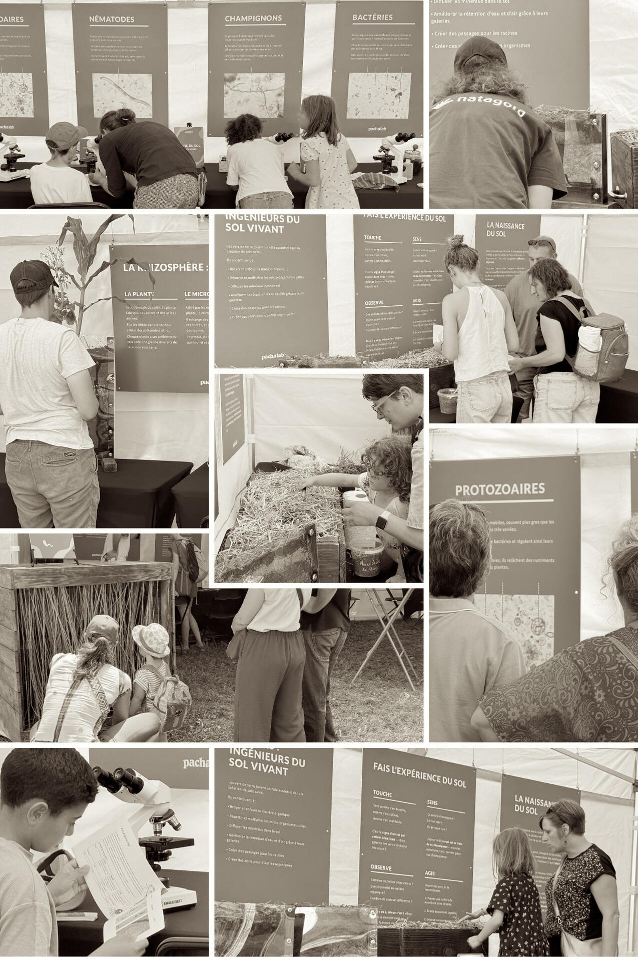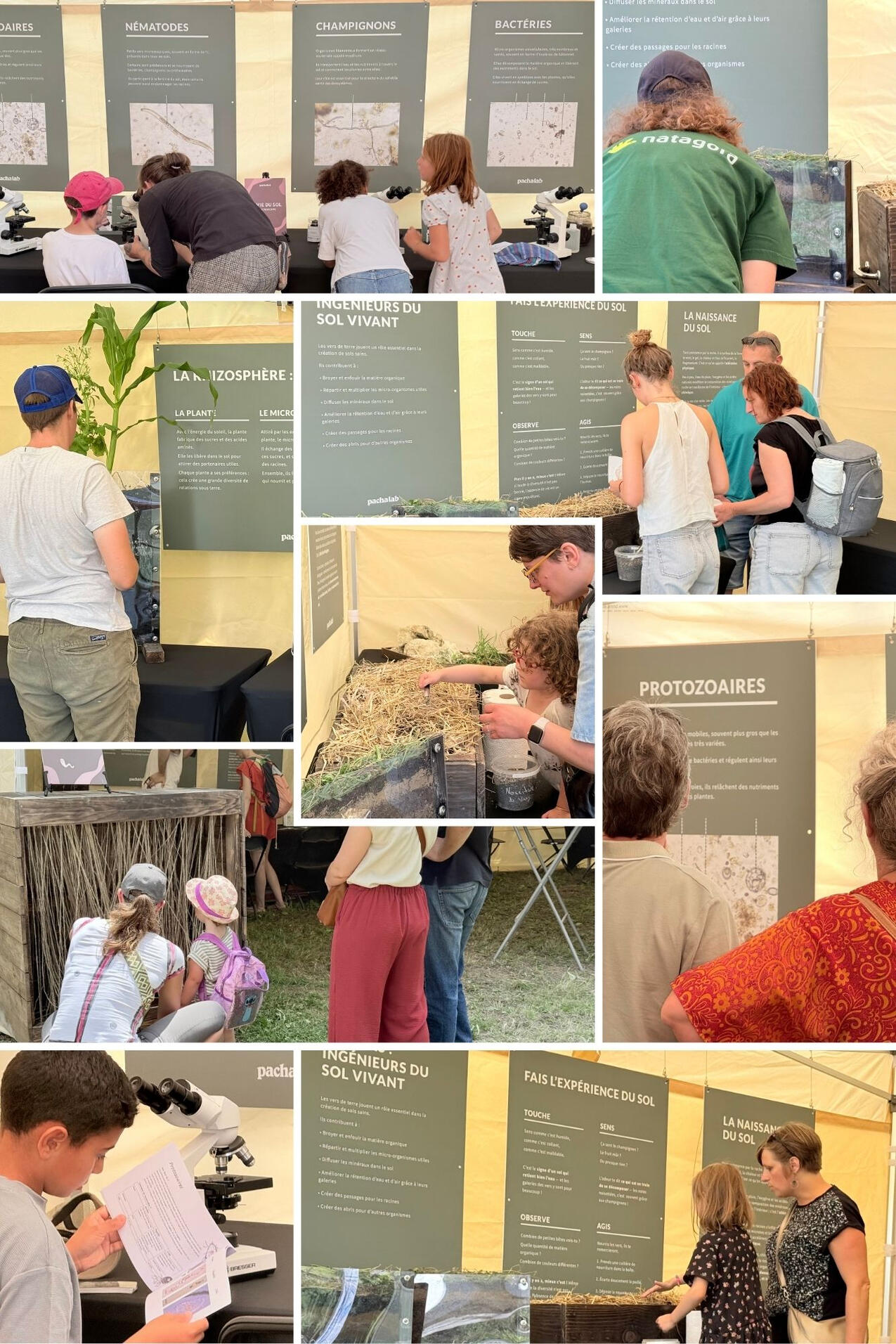 Nous avons créé le premier musée mobile des sols vivants pour rendre visible l’invisible : la vie microscopique qui se cache sous nos pieds et dont dépend la fertilité de nos terres, la qualité de notre alimentation, et l’équilibre de notre climat.Ce musée se déplace dans les fermes, foires, écoles et événements pour offrir une expérience immersive et pédagogique à tous les publics. À travers une série de panneaux illustrés, il invite à découvrir le rôle essentiel des micro-organismes du sol dans le fonctionnement des écosystèmes.Chaque image ci-dessous correspond à l’un des panneaux du musée. Vous pouvez les parcourir ici comme si vous étiez en visite, et explorer à votre rythme ce monde vivant encore largement méconnu.